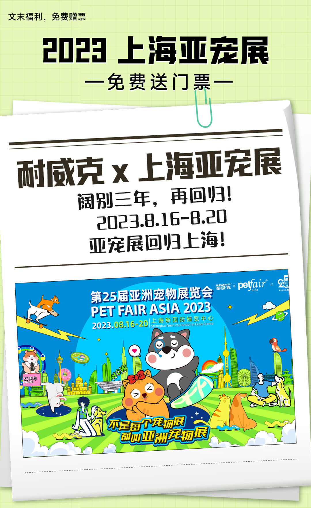 您當(dāng)前的位置:首頁(yè) > 關(guān)于耐威克 > 企業(yè)新聞 > 2023亞寵展回歸上海!快去耐威克各大官方平臺(tái)領(lǐng)取免費(fèi)票