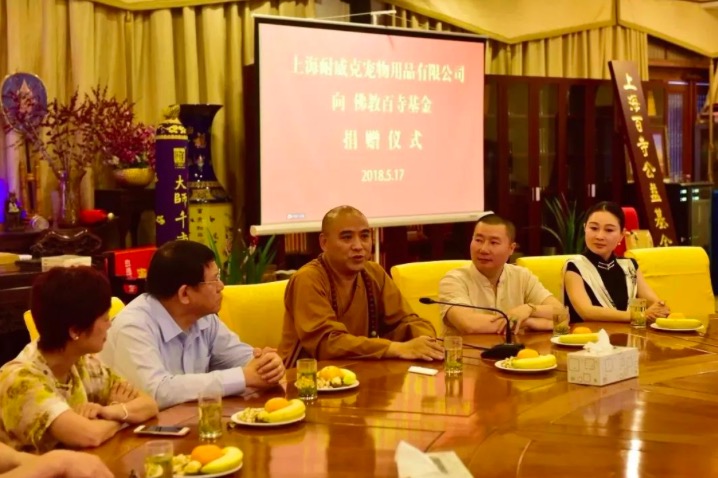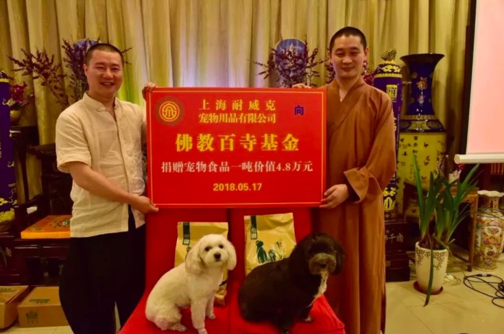 2018年5月17日下午,上海耐威克寵物用品有限公司與佛教百寺基金舉行捐贈儀式,上海耐威克寵物用品有限公司向佛教百寺基金捐贈寵物食品一噸。捐贈儀式上,在慧明會長提議,愛心善信支持下,出資一百萬元在佛教百寺基金下設(shè)立“愛護動物專項基金”。